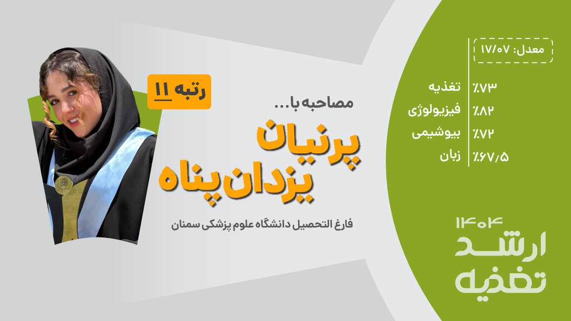 سال ۱۴۰۴ از دانشگاه علوم پزشکی سمنان با معدل ۱۷.۰۷ فارغ التحصیل شدم. درصدام تغذیه ۷۳٪، بیوشیمی ۷۲٪، فیزیولوژی ۸۲٪ و زبان ۶۷.۵٪