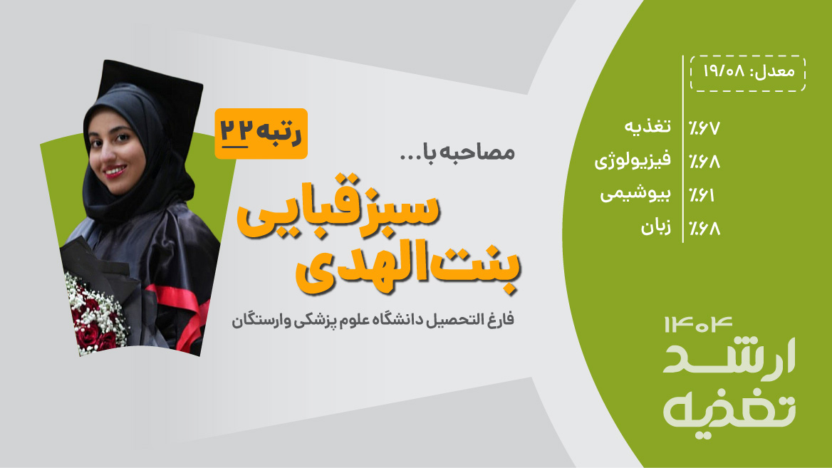 من در سال 1403 از دانشگاه علومپزشکی وارستگان با معدل 19/08 فارغالتحصیل شدم درصد دروس به ترتیب تغذیه 66.6، بیوشیمی 61.1، فیزیولوژی 67.7 و زبان 68.3 بود.