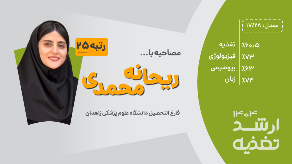 سلام، ریحانه محمدی هستم، رتبه ۲۳ سهمیه و ۲۵ کل، فارغالتحصیل دانشگاه علوم پزشکی زاهدان ورودی بهمن ۹۹ و بهمن ۱۴۰۳ فارغالتحصیل شدم. معدلم در دوره کارشناسی ۱۷/۲۸ بود. درصدها تغذیه ۶۰/۵_ بیوشیمی ۶۳/۳_ فیزیولوژی ۷۳/۳_ زبان ۷۴/۱۶