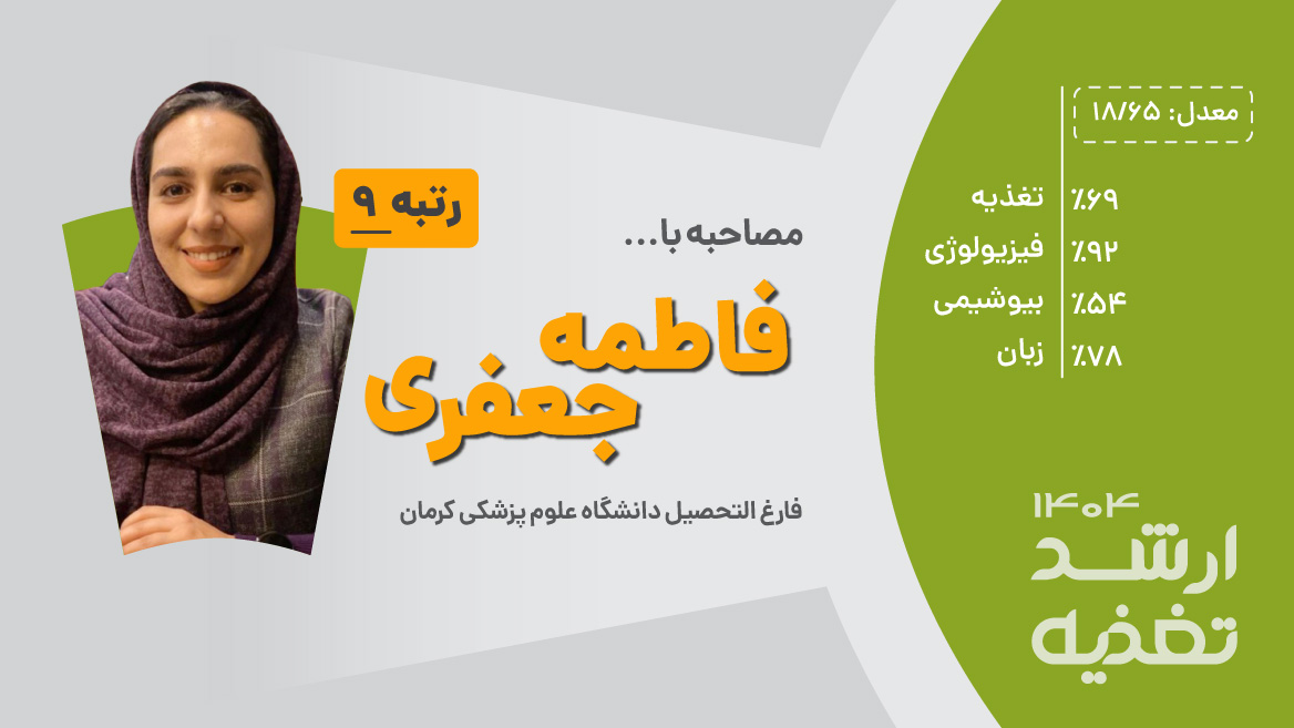 سال ۱۴۰۱ از دانشگاه علومپزشکی کرمان با معدل ۱۸.۶۵ فارغ التحصیل شدم. درصدهای کنکورم تغذیه: ۶۹.۴۴٪ - بیوشیمی: ۵۴.۴۴٪ - فیزیولوژی: ۹۲.۲۲٪ - زبان: ۷۸.۳۳٪ بود.